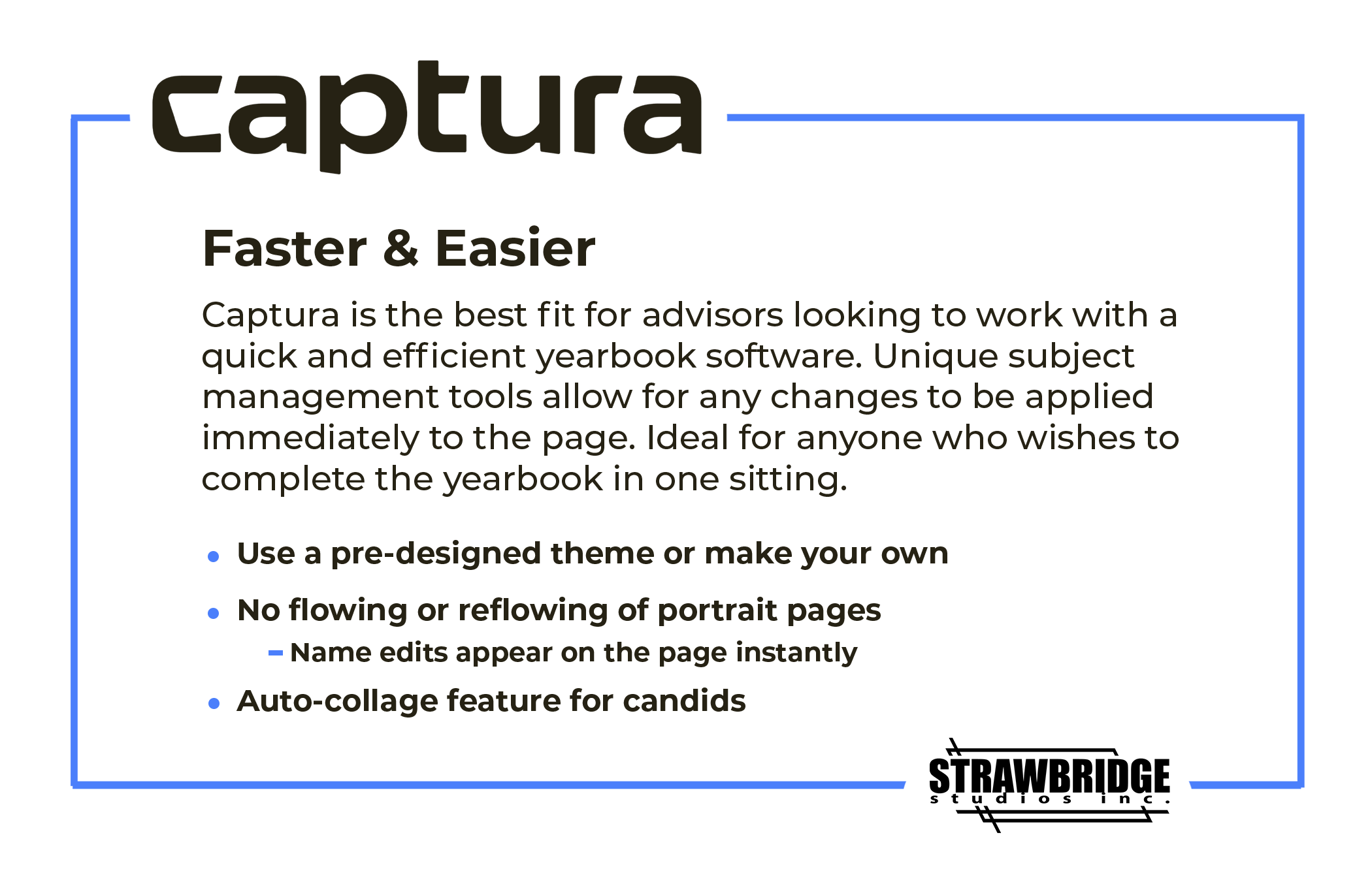 Our Memory Book serves as a wonderful way to capture each school year in full to hold onto forever. Our book has multiple binding and cover options to ensure you can find the best fit for you. We also operate through Captura.